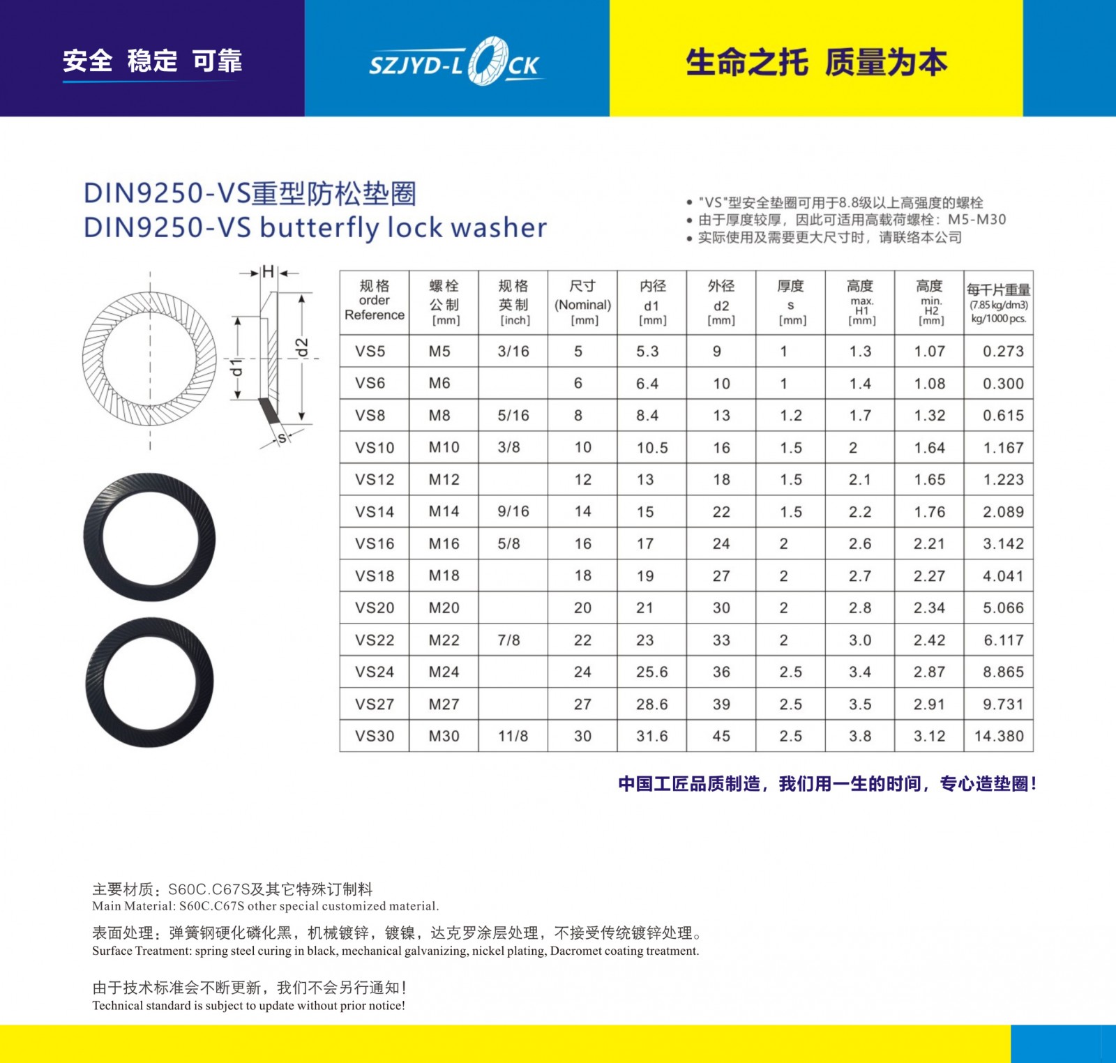 VS防松垫圈、执行DIN9250德国标准、按螺栓的使用条件分为两类:VS防松垫圈配合10.9级以上螺栓使用、