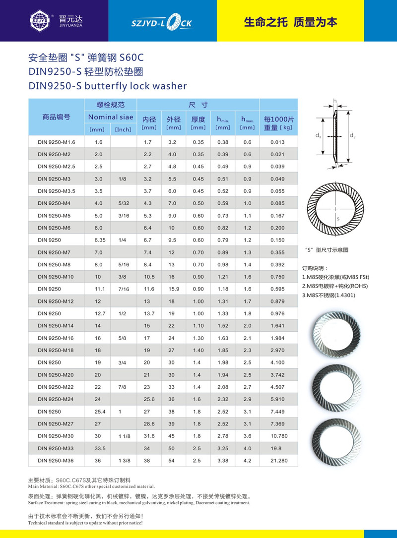 DIN9250防松垫圈、执行德国标准、按螺栓的使用条件分为两类:8.8级以下螺栓均选用S轻型安全防松垫圈、10.9级以上螺栓均先用VS重型安全垫圈系列、