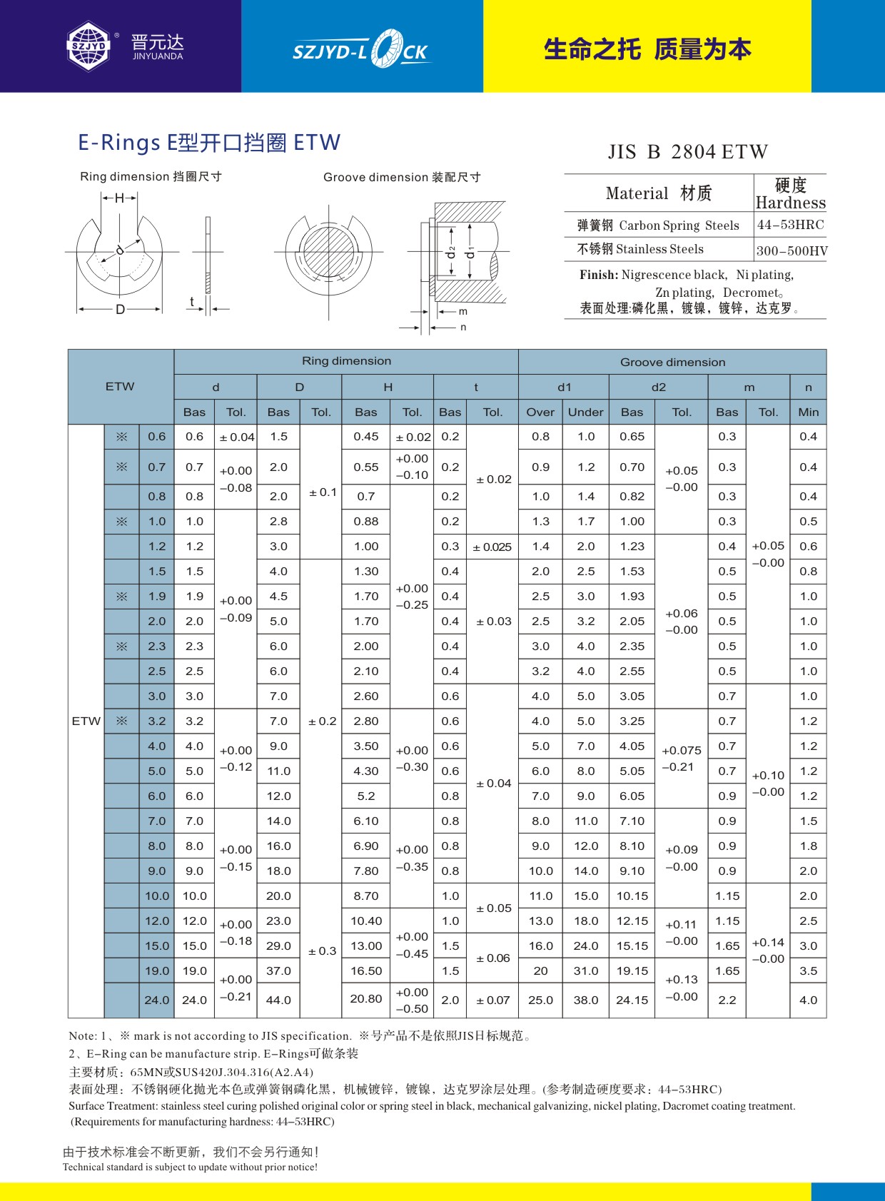 日标JIS2804开口挡圈,使用65MN.C67S弹簧钢剪切冲压,经抛光后硬化处理,表面采用磷化黑或机工镀锌处理!瑞士模走丝精密模具开发,精密度可以做到M0.6规格!还可根据用户要求订制特殊尺寸型号!史特牢专注精品挡圈设计制造!