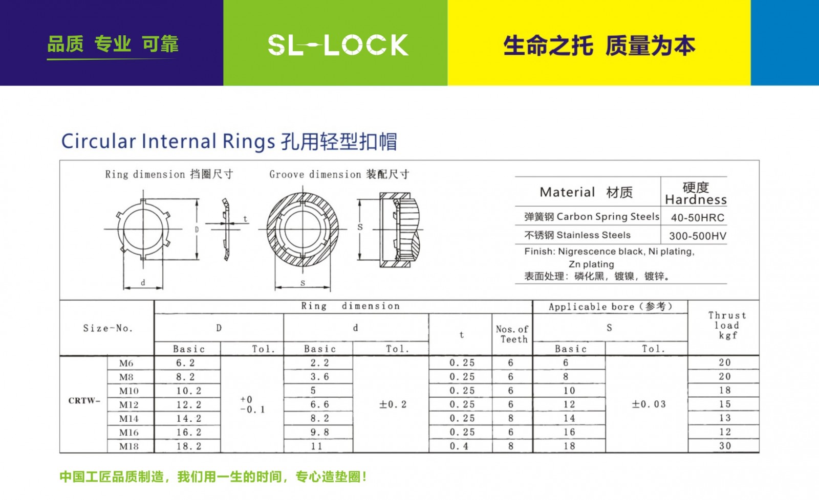 名称:轻型孔用止动垫圈    执行标准:CRTW       型号:M6-M18         材质:65MN/C67S     表面处理:磷化黑色