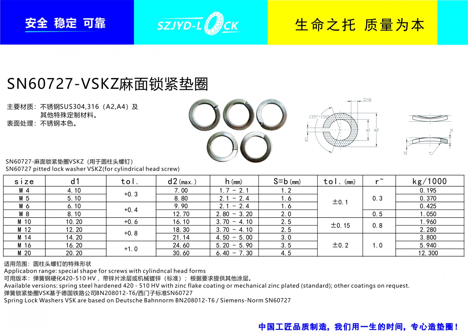 SN60727-VSKZ不锈钢麻面垫圈由西门子轨道交通公司设计制定、基于张力摩擦的构造原理。鞍形垫圈表面麻面花纹与螺栓锁紧面接触,增大的锁紧力起到了明显防松功能!VSKZ标准窄型麻面垫圈适用于较小安装空间!