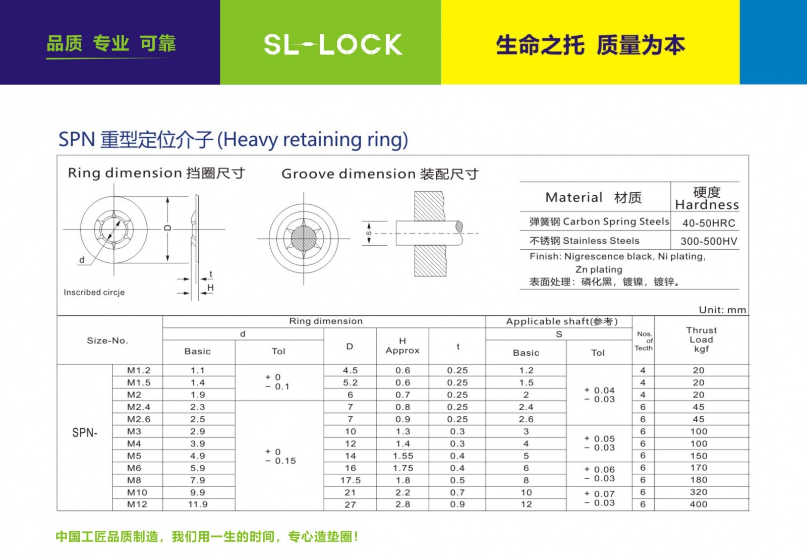 轻型轴用定位介子 执行标准:SPN 型号:M1.2-M12 材质:65MN.SUS304.316 表面处理:磷化黑色